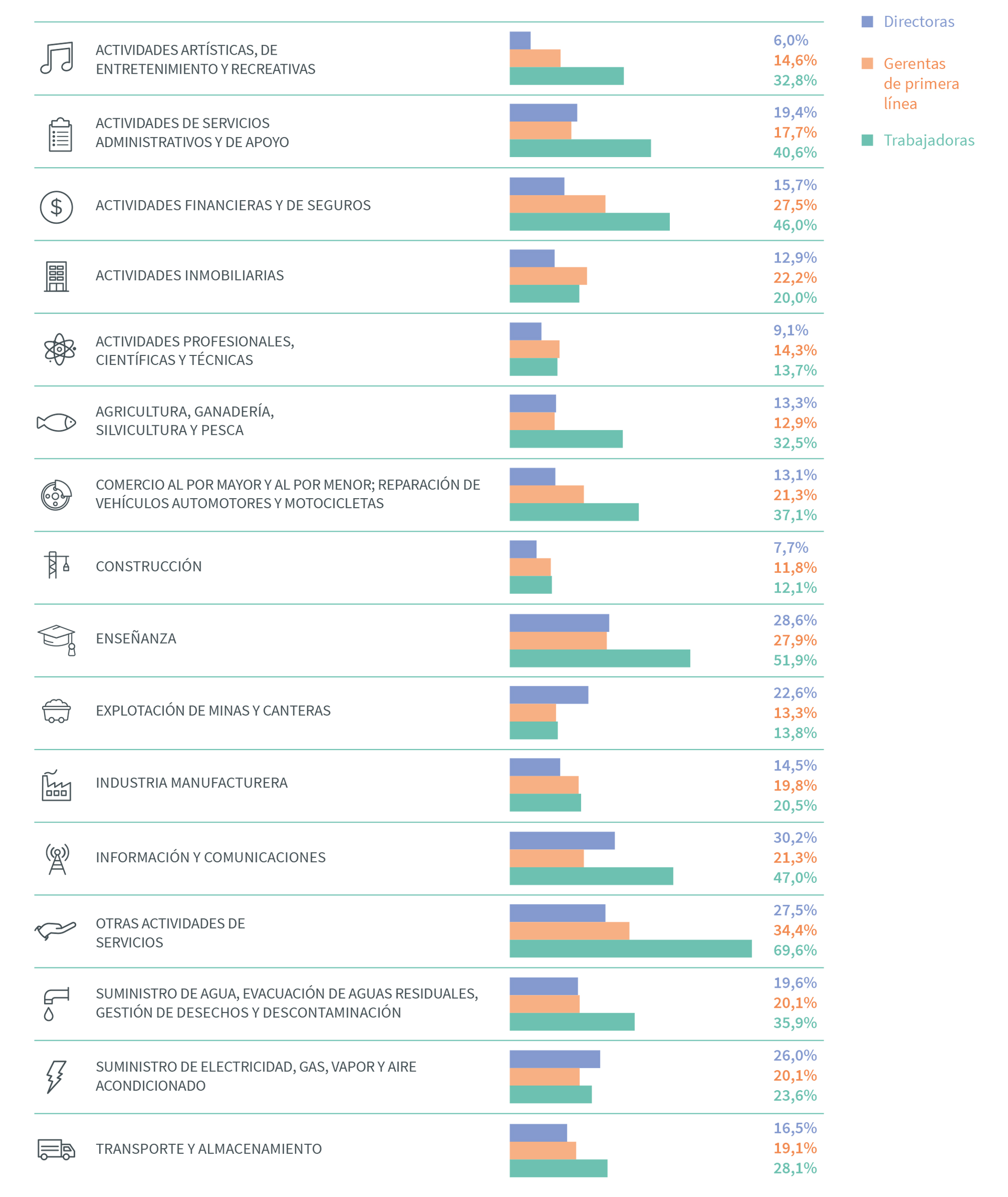 Por otro lado, existen cuatro rubros bajo el umbral del 20% de participación de mujeres. Estos son Construcción (12,1%), Actividades profesionales, científicas y técnicas (13,7%), Explotación de minas y canteras (13,8%), y Actividades inmobiliarias (20,0%).