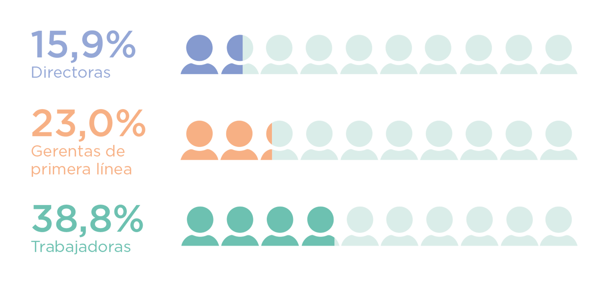 Se reportaron 364.444 mujeres en las 466 entidades consideradas, es decir 38,8% del total de personastrabajadoras (véase Gráfico 6). En los cargos de gerencia de primera línea, de un total de 6.403 personas, solamente 1.473 son mujeres, lo que representa un 23%. En los directorios, en el nivel más alto de responsabilidad de las empresas, predominan los hombres. De un total de 3.324 personas en cargos directivos, 528 son mujeres, representando solo un 15,9% del total. Es en este nivel donde se encuentra el menor porcentaje de participación de mujeres.