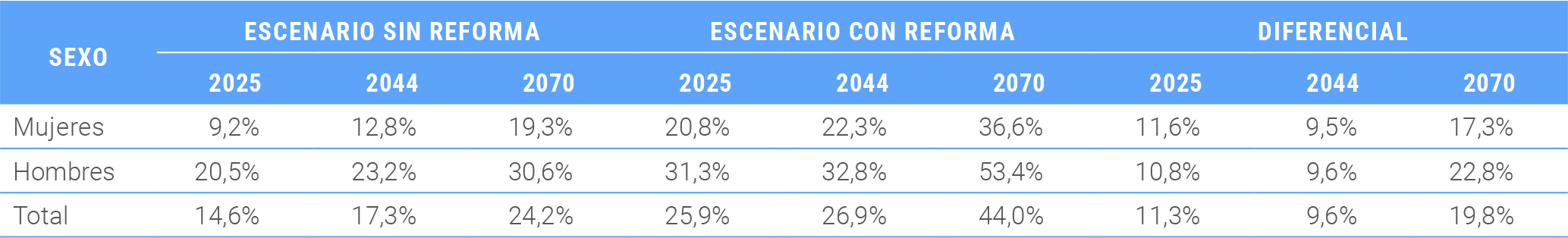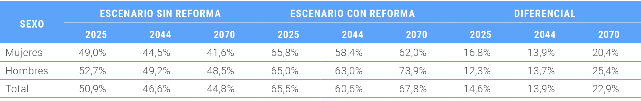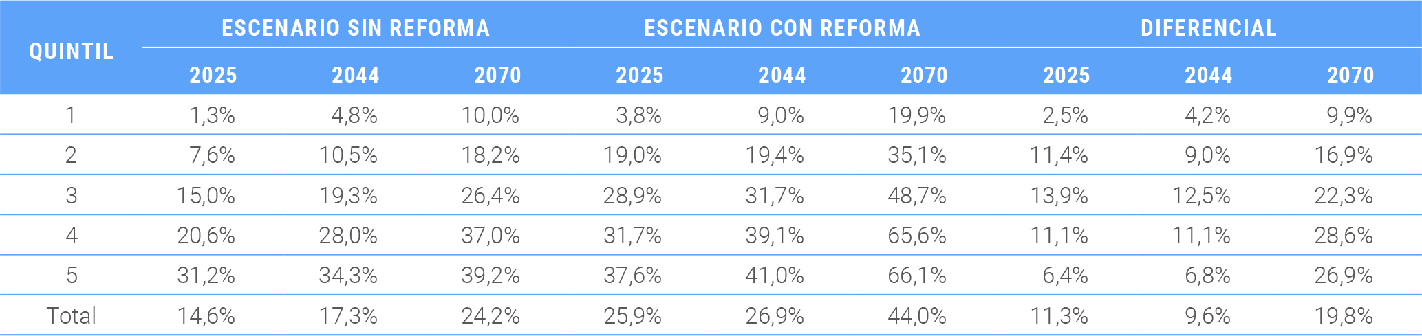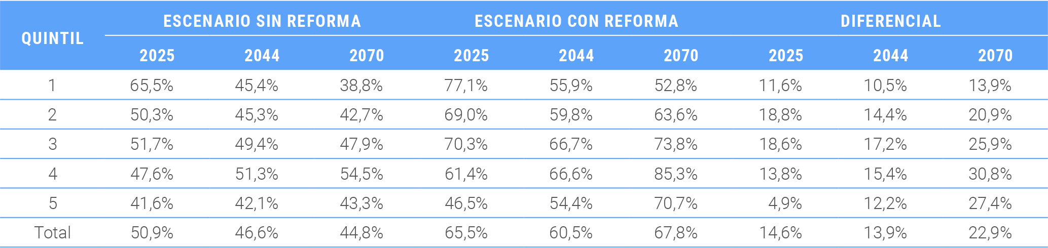 Adicionalmente, en los cuadros siguientes, se presenta los efectos en tasa de reemplazo contributivas por sexo y quintiles considerando un escenario de densidades de 10 por ciento mayores de cotizaciones durante la etapa activa de los cotizantes, así como un mayor retorno de las inversiones producto del cambio a Fondos Generacionales. Se observa que estas modificaciones generarían un efecto incremental sobre la tasa de reemplazo al año 2044 de 2,3 puntos porcentuales adicionales y en 2070, de 8,3 puntos porcentuales adicionales.