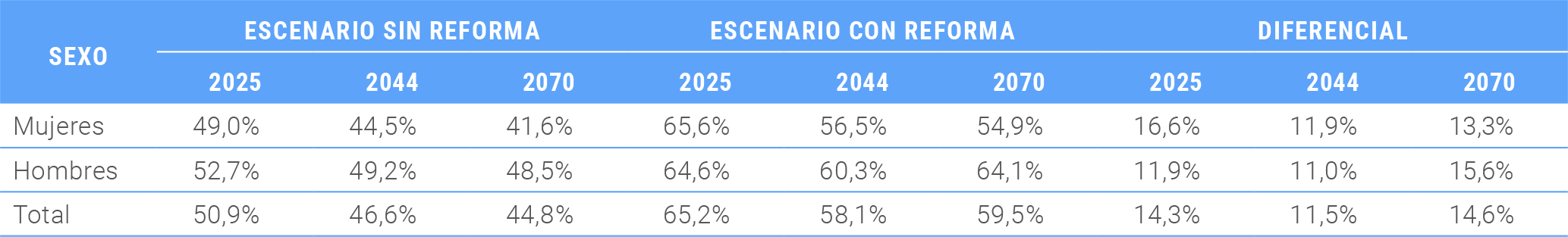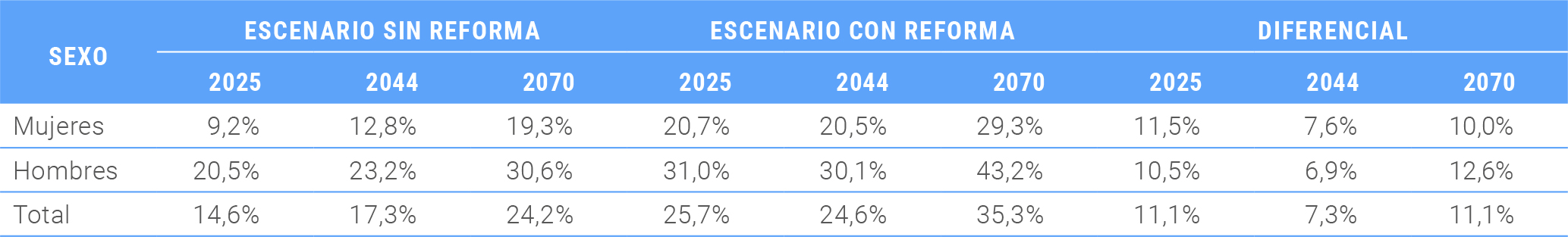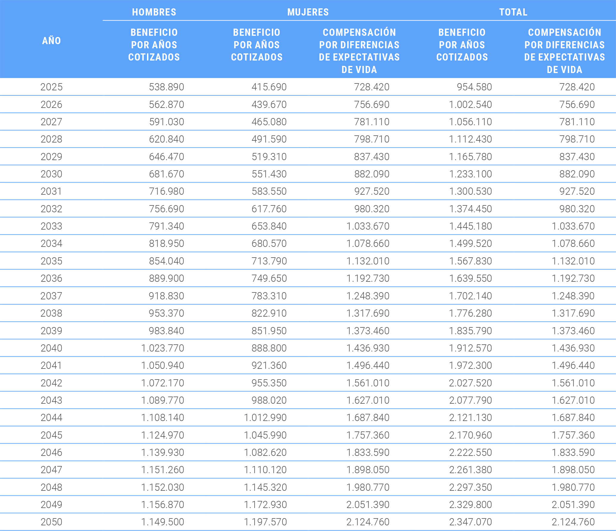 Respecto de la compensación por diferencias de expectativa de vida, se estima como efecto de la reforma, que el primer año de vigencia la recibirán 728.420 mujeres, cifra que aumentará progresivamente en el tiempo, hasta llegar a 2.124.760 mujeres beneficiarias en el año 2050.
