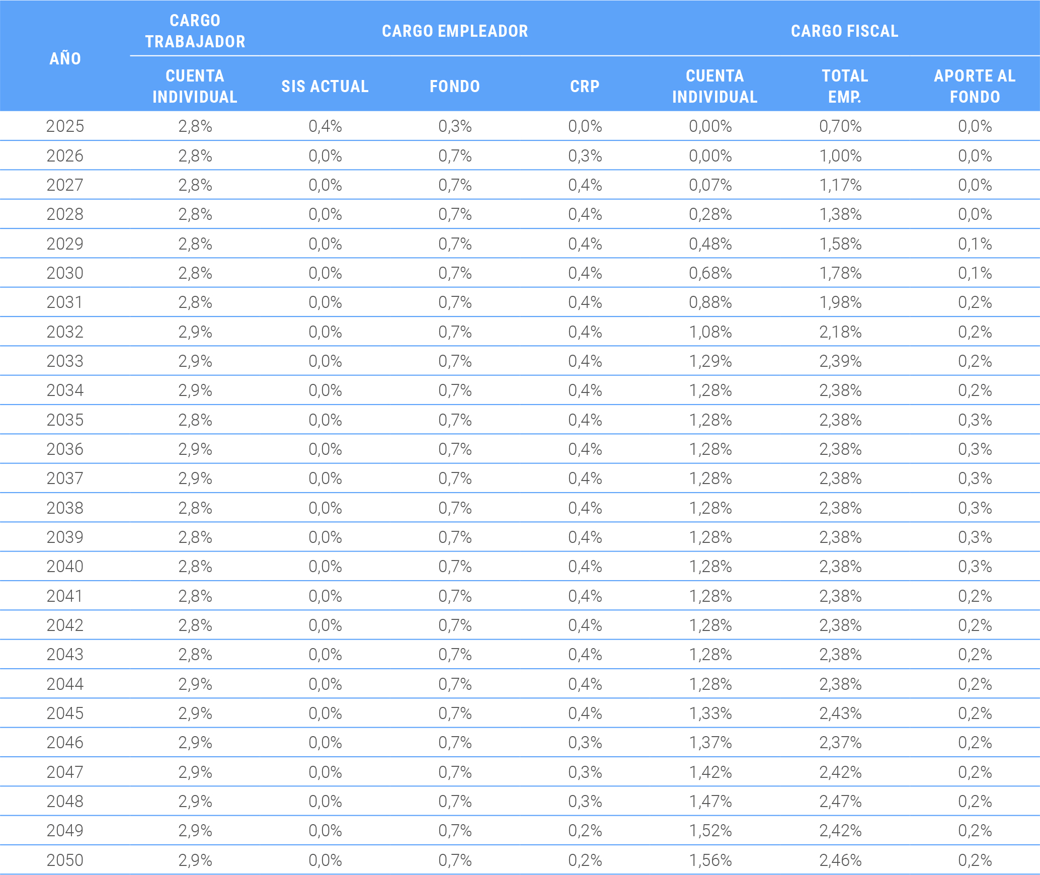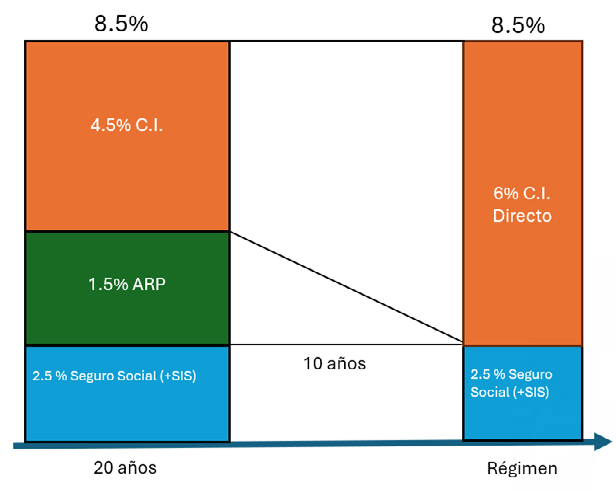 [2] La tasa es fija en el tiempo y absorbe la prima del Seguro de Invalidez y sobrevivencia que actualmente es variable según la siniestralidad, y se ajusta por trimestre. La ventaja de fijar una tasa con un valor constante en el tiempo es que da certezas a los empleadores.