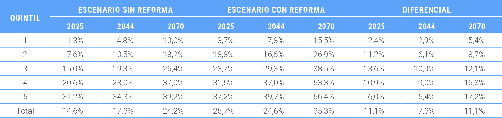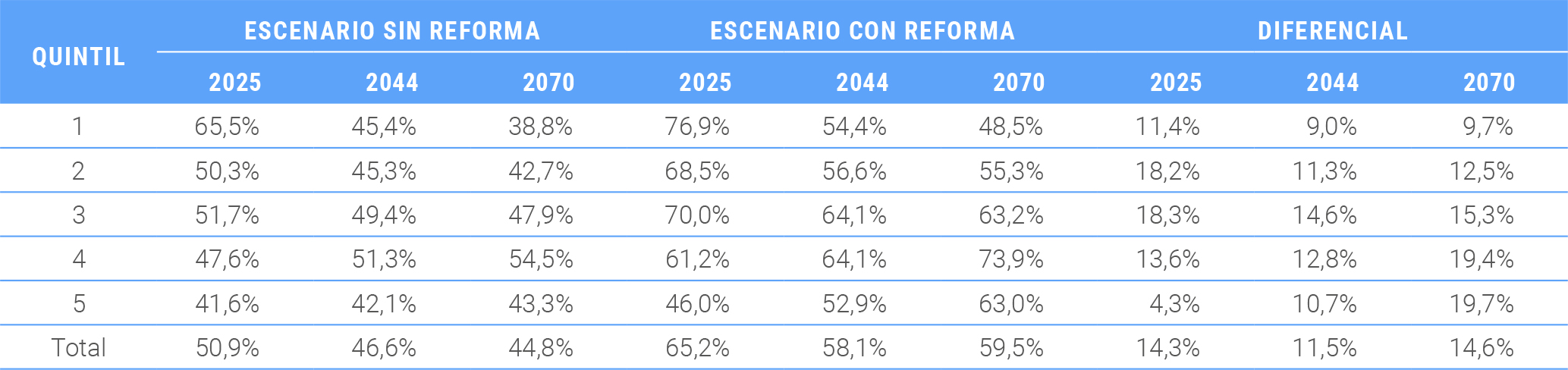 Al separar el anterior análisis según quintiles, se puede apreciar que el efecto de los beneficios está concentrado en los quintiles 2 al 4, que verían un diferencial de 11 puntos porcentuales y más en el corto plazo. En el largo plazo, el aumento de la tasa de cotización en las cuentas individuales mejorará las pensiones principalmente de los quintiles superiores.