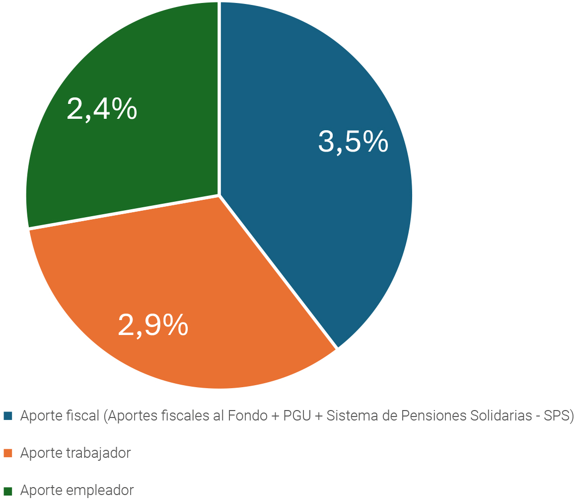 En el cuadro anterior no se presentan los ingresos de las AFP por comisiones ya que no afectan las pensiones contributivas, y sólo constituyen un costo del sistema. Tampoco se incorpora el gasto fiscal por PGU, que en el mediano plazo variará desde 2,2% del PIB a 2,5%, a pesar de que una parte importante de las transferencias de la PGU complementan pensiones contributivas. Con todo, al considerar los aportes totales de los empleadores, de los trabajadores y del Fisco (incluyendo el financiamiento de la PGU y el sistema de pensiones solidarias), se obtiene que la distribución será cercana a un tercio por cada una de las partes (Gráfico 1).