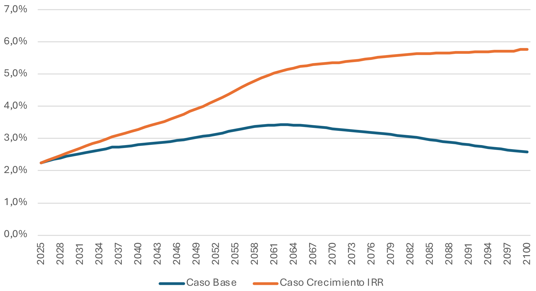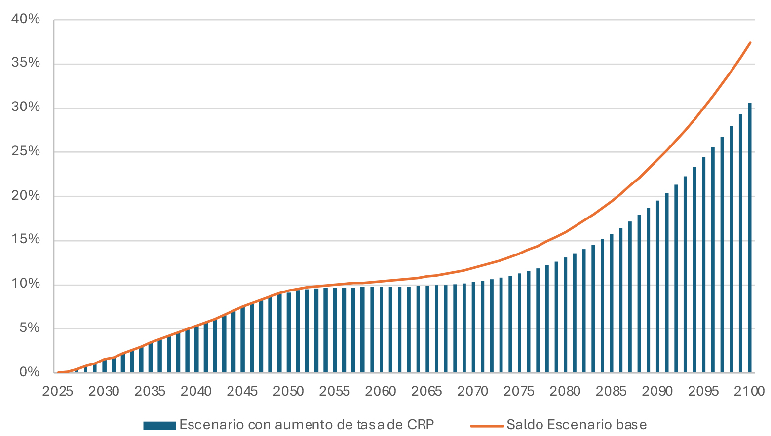 Para evaluar el efecto del aumento de la tasa del aporte con rentabilidad protegida se asumió un aumento de 0,5% en el retorno del CRP de forma continua, llegando a 3%. Para estresar el ejercicio además se asumió que no existen efectos similares en el aumento de los activos del fondo.