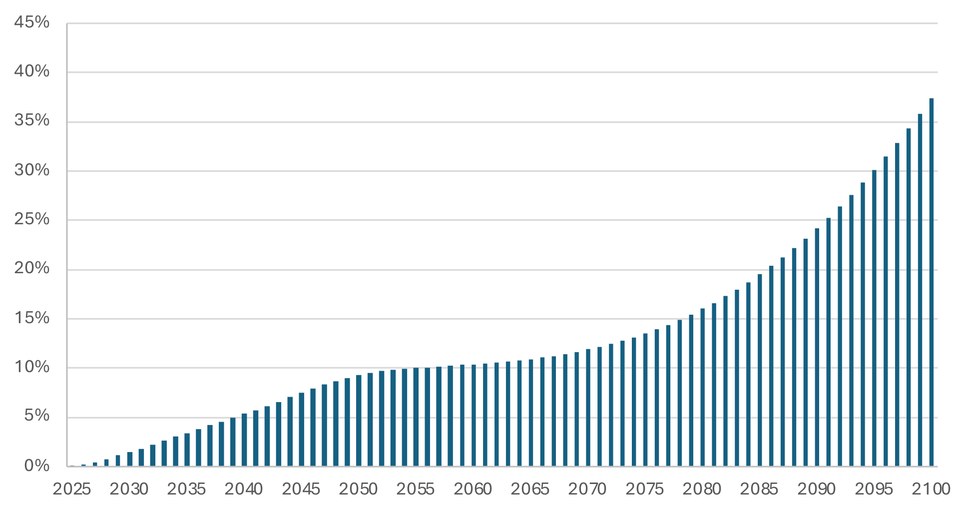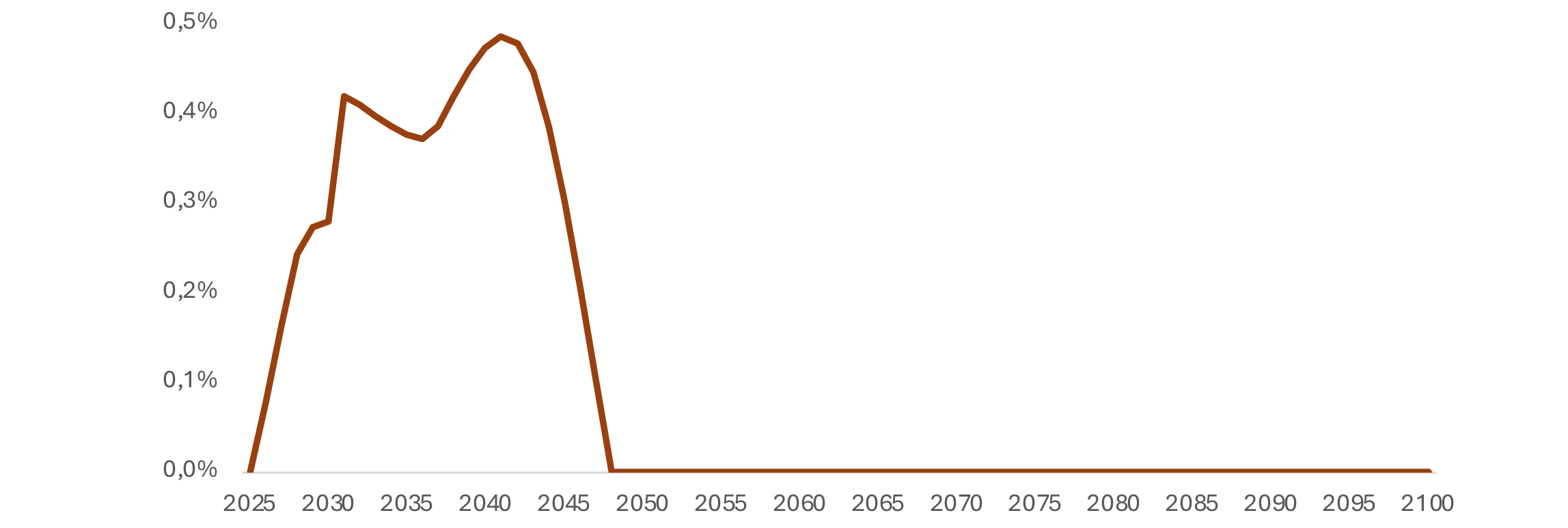 En el Gráfico 5 se presenta la diferencia positiva entre los compromisos y los activos financieros del fondo. La diferencia antes descrita puede ser considerada como la exposición máxima, tiene un valor superior en torno a 0,5% del PIB (casi un quinto del gasto en PGU de un año). Para el 2050, por el crecimiento del fondo y la reducción de los compromisos, los activos financieros superan los compromisos.