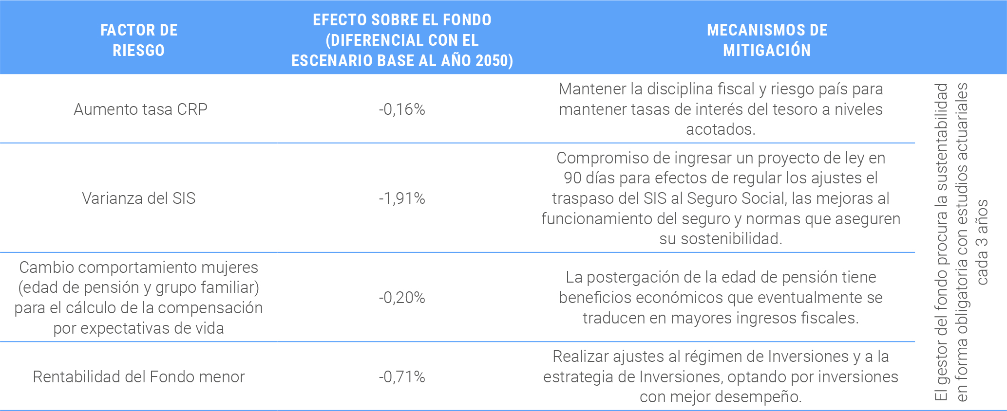 El cuadro a continuación presenta un resumen de los factores de riesgo que podrían afectar al fondo, sus efectos sobre el saldo y las posibles mecanismos de mitigación que contempla el proyecto de ley.