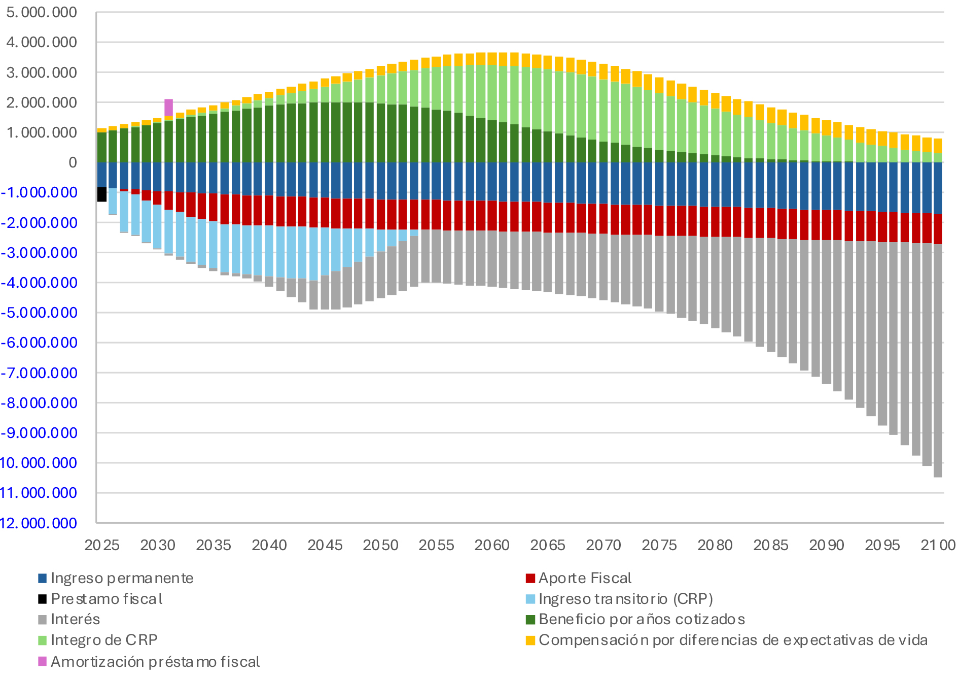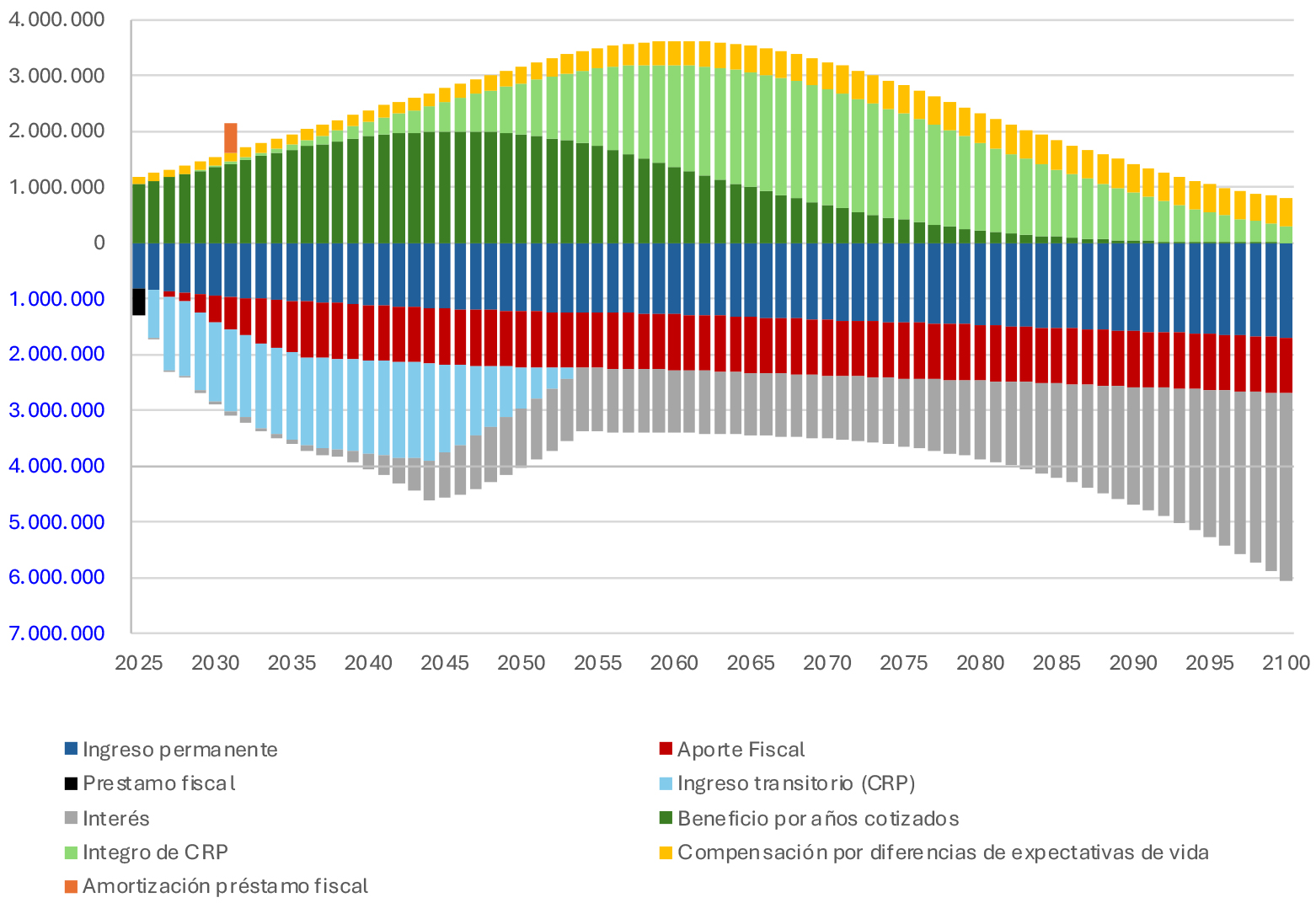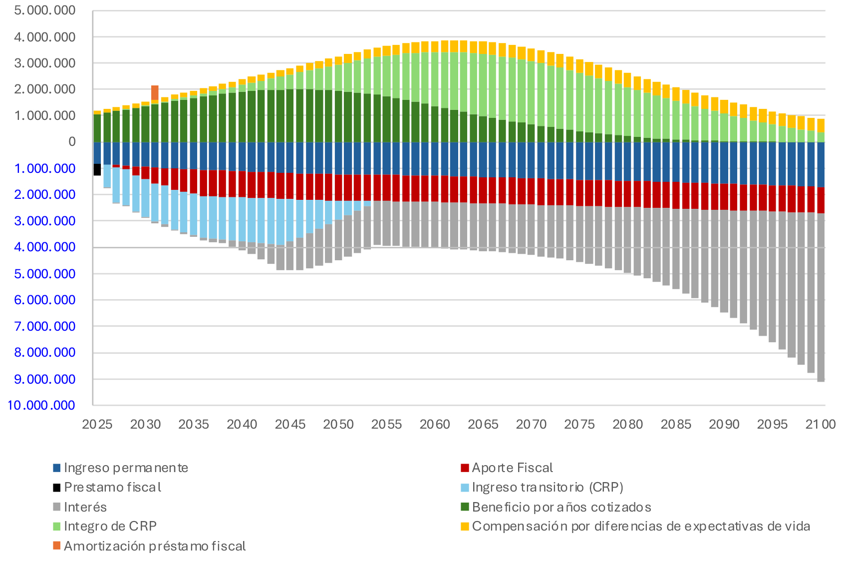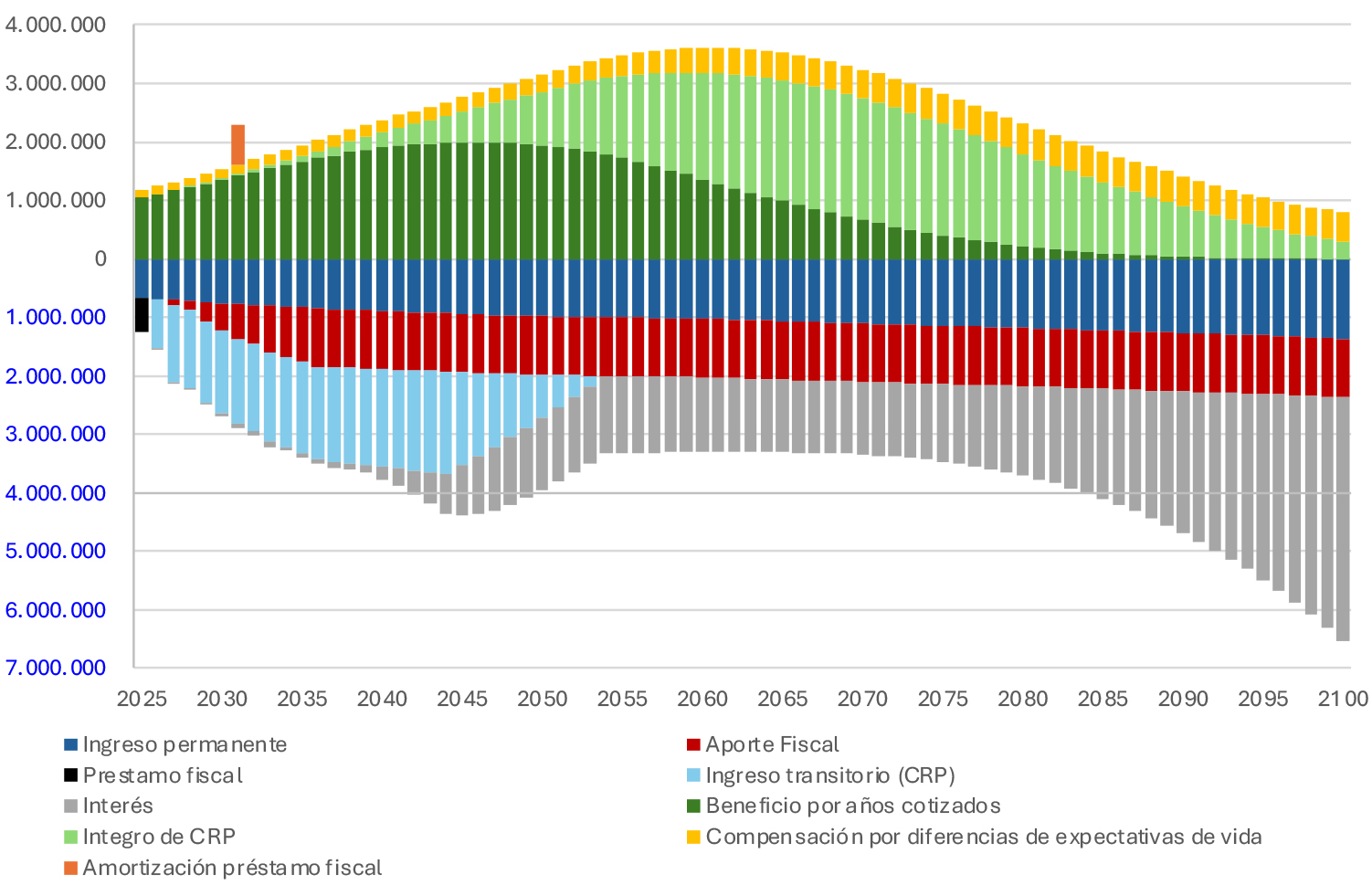 El modelamiento del Fondo y sus beneficios utilizando los parámetros antes definidos entrega una proyección de ingresos y gastos que se consignan en el siguiente gráfico. Los valores positivos representan los cargos al Fondo, tanto los beneficios como la Cotización con Rentabilidad Protegida, el beneficio por años cotizados y la compensación a las mujeres por diferencias en expectativas de vida, como la devolución de las cotizaciones con rentabilidad protegida. En cambio, los valores negativos representan el aumento de valor del Fondo, desde las cotizaciones, los aportes fiscales, y el resultado de sus inversiones.
