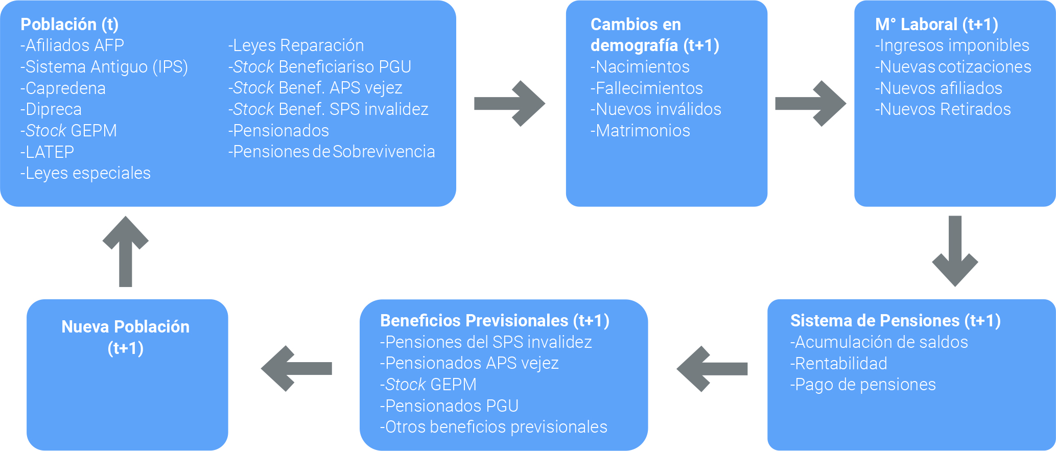 Durante los últimos años, la DIPRES ha realizado diversas actualizaciones y cambios al modelo de proyección de pensiones a partir de la explotación de grandes volúmenes de datos provenientes del Sistema de Información de Datos Previsionales administrado por el Instituto de Previsión Social, además de la información disponible en los registros administrativos de la Superintendencia de Pensiones[4].