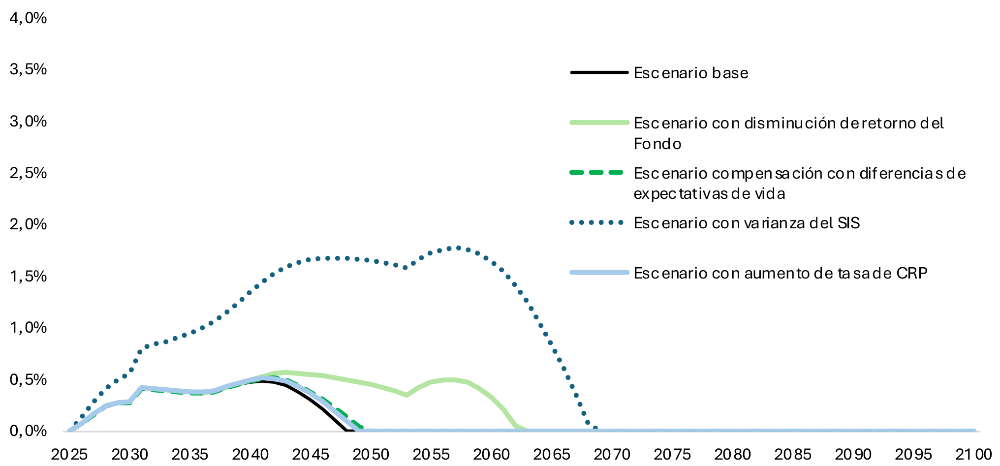 Los escenarios de aumento de tasa de la Cotización con Rentabilidad Protegida y la reducción de la rentabilidad del Fondo, tienden a tener efectos similares, pero en momentos diferentes del tiempo. Mientras que el escenario con varianza de la tasa del Seguro de Invalidez y Sobrevivencia (SIS), es el que genera el mayor valor de pasivo contingente, puesto que afecta los ingresos permanentes del Fondo durante todo el periodo de evaluación.