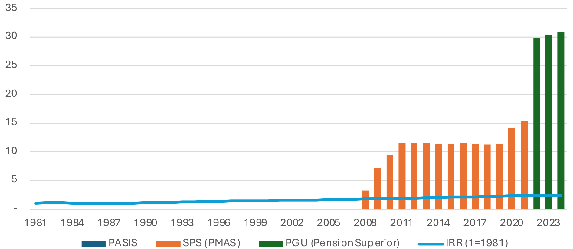 De la misma forma, se muestra una sostenida expansión del pilar no contributivo hacia el pilar contributivo, dado que se entregan pensiones no contributivas a personas que tienen pensiones contributivas, que en el caso de la PGU alcanzan las 30 UF mensuales, la cual corresponde a la pensión superior para poder acceder al beneficio (Gráfico 16).
