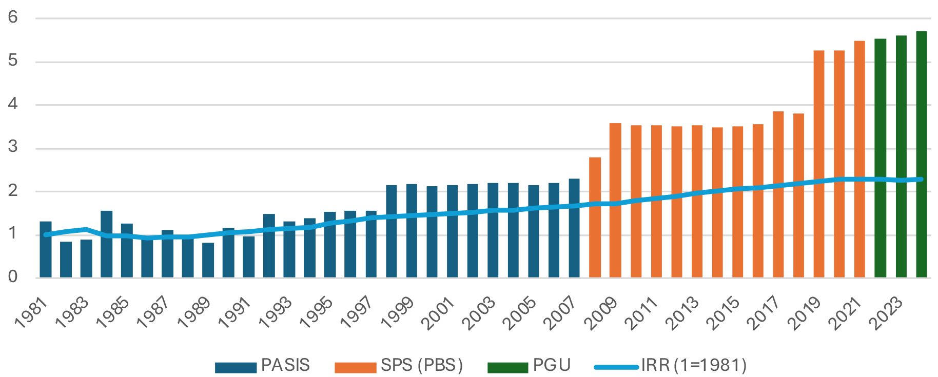 Desde la creación del sistema de pensiones de capitalización individual en 1981 se ha incrementado la transferencia máxima del sistema no contributivo, que rondaba 1 UF al inicio de la década de los ochenta y que a partir del año 2019 superaba las 5 UF, hasta llegar a niveles cercanos a las 6 UF en 2024. Esta trayectoria de crecimiento empieza a desacoplarse de manera creciente respecto del crecimiento de las remuneraciones reales, a partir del año 1998 (Gráfico 15).
