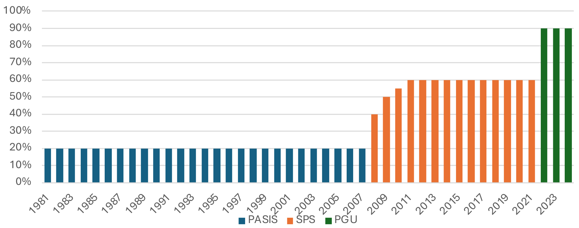 [10] En el primer grupo de personas que se beneficia del incremento de la PGU, se incluye a los beneficiarios de la Pensión Básica Solidaria de Invalidez establecida en la ley N°20.255 y del Subsidio de Discapacidad Mental (SDM) para menores de 18 años, cuyo monto del beneficio corresponde al 50% de la PGU.