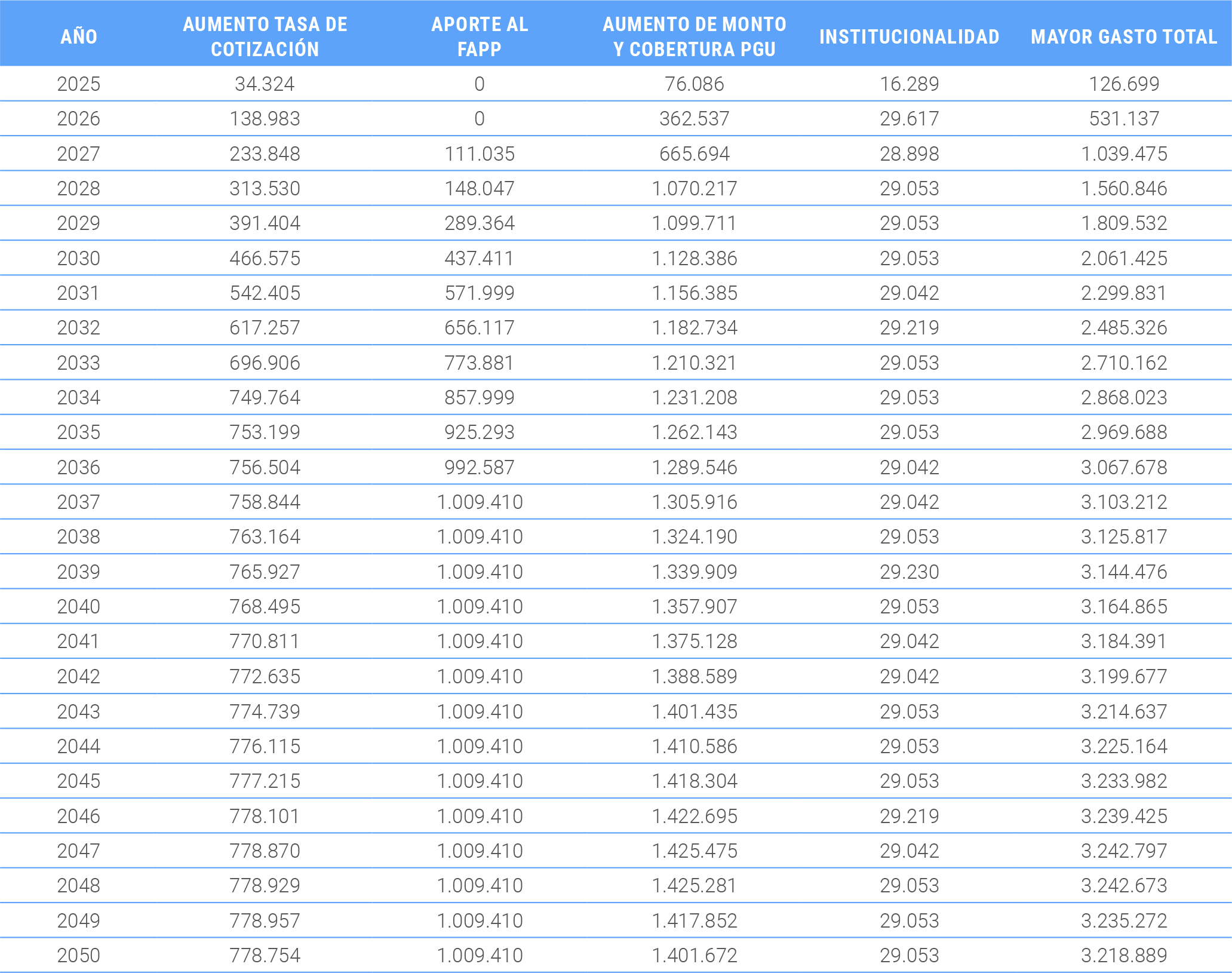 Resumen de la proyección de mayor gasto fiscal por la reforma de pensiones