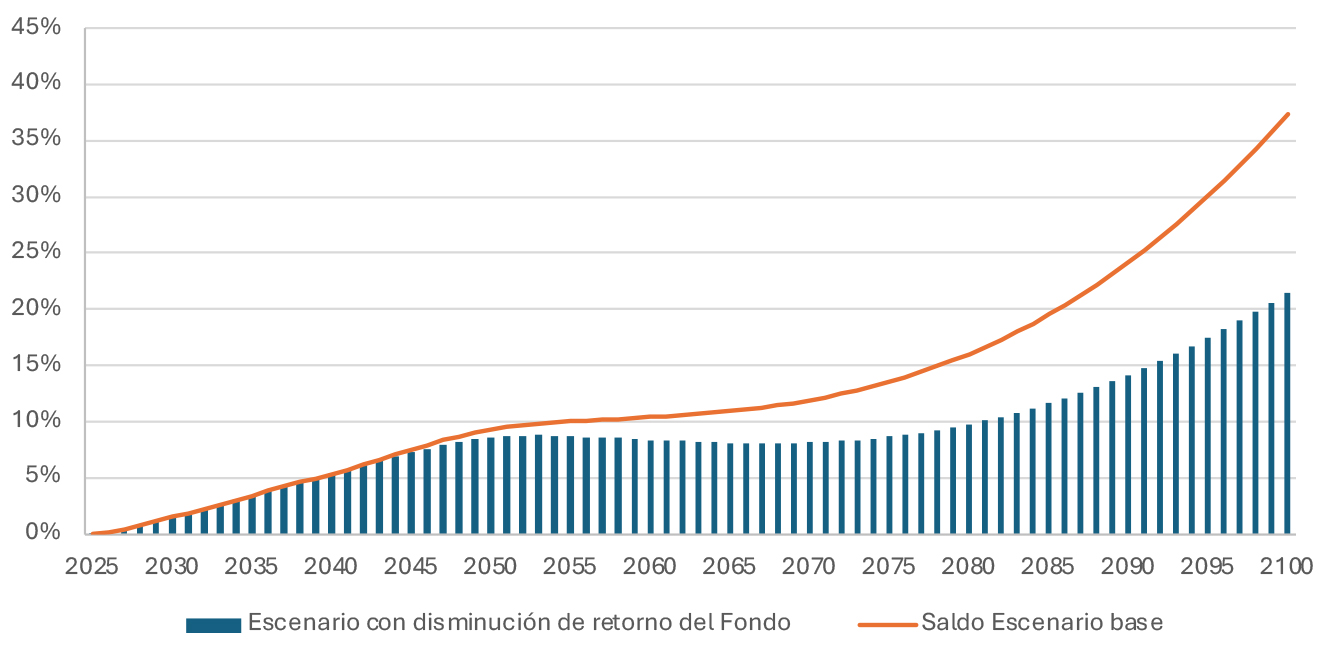 Finalmente, como todos los fondos que mantienen reservas, la rentabilidad del fondo puede tener un rol importante en la sustentabilidad del mismo. En este análisis se supone una baja de rentabilidad de 100 puntos base de forma permanente respecto del escenario base, manteniéndose en 2,9%.