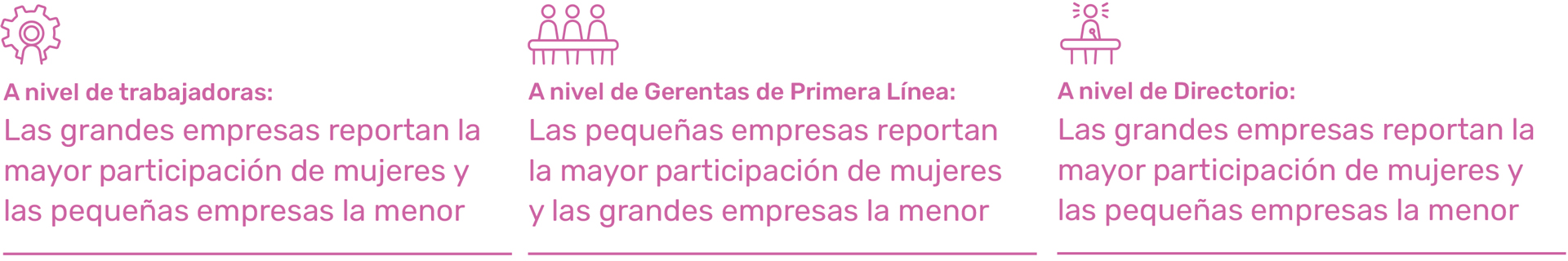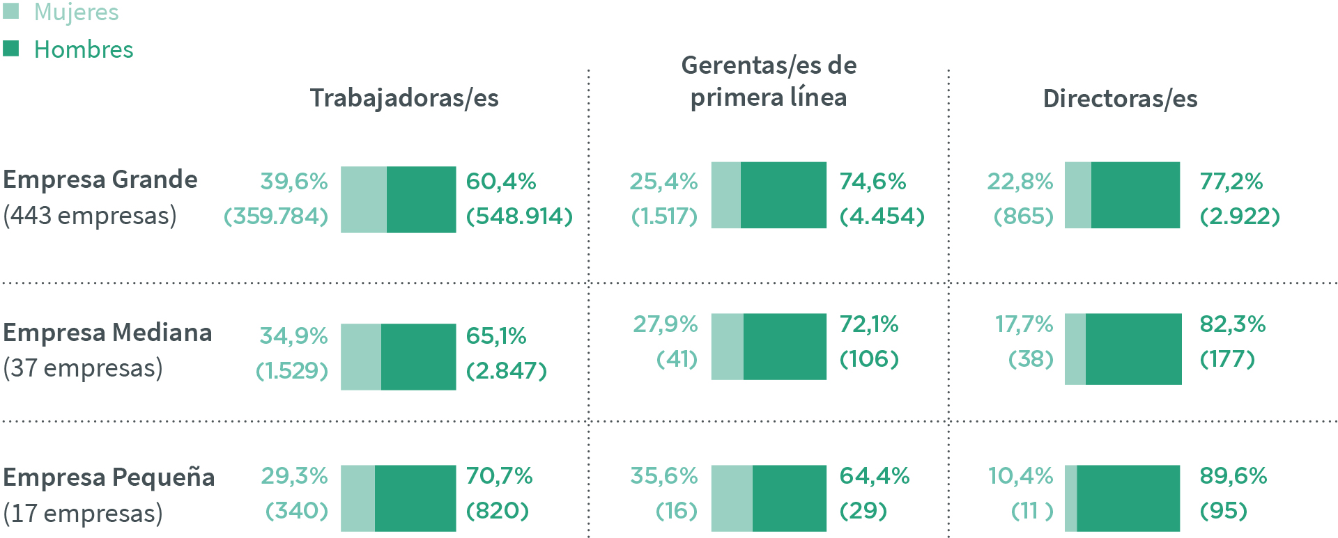 A nivel de gerencias de primera línea las pequeñas empresas registran la participación de mujeres más alta, con 35,6% de los cargos gerenciales. Le siguen las empresas medianas, donde esta cifra es de 27,9%. En cambio, las empresas grandes presentan la menor participación de mujeres en gerencias de primera línea, con 25,4% de gerentas.