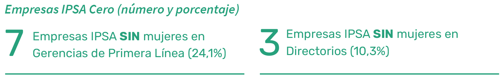 Todas las empresas IPSA consideradas en este reporte cuentan con mujeres en su dotación. No obstante, la situación cambia al evaluar los niveles gerenciales y de directorio. En total, siete empresas (24,1%) no tienen mujeres en sus gerencias de primera línea, mientras que tres empresas (10,3%) carecen de representación femenina en sus directorios.